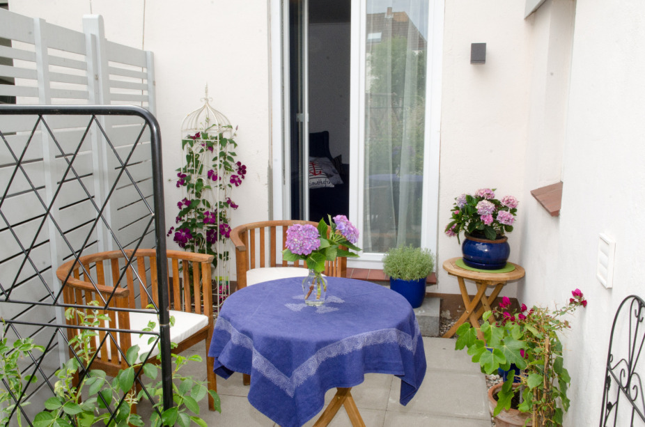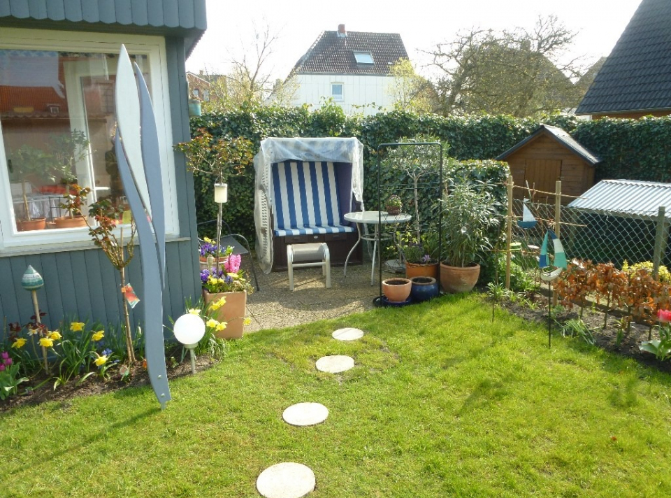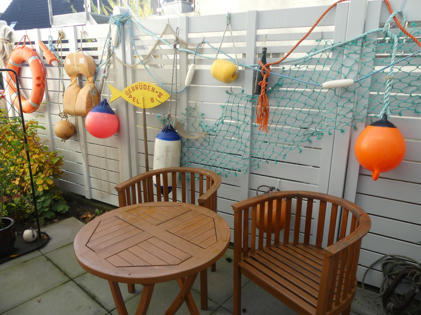 Möbel und Auflagen für die maritime Terrasse vorhanden, Gartenbenutzung mit Strandkorb möglich